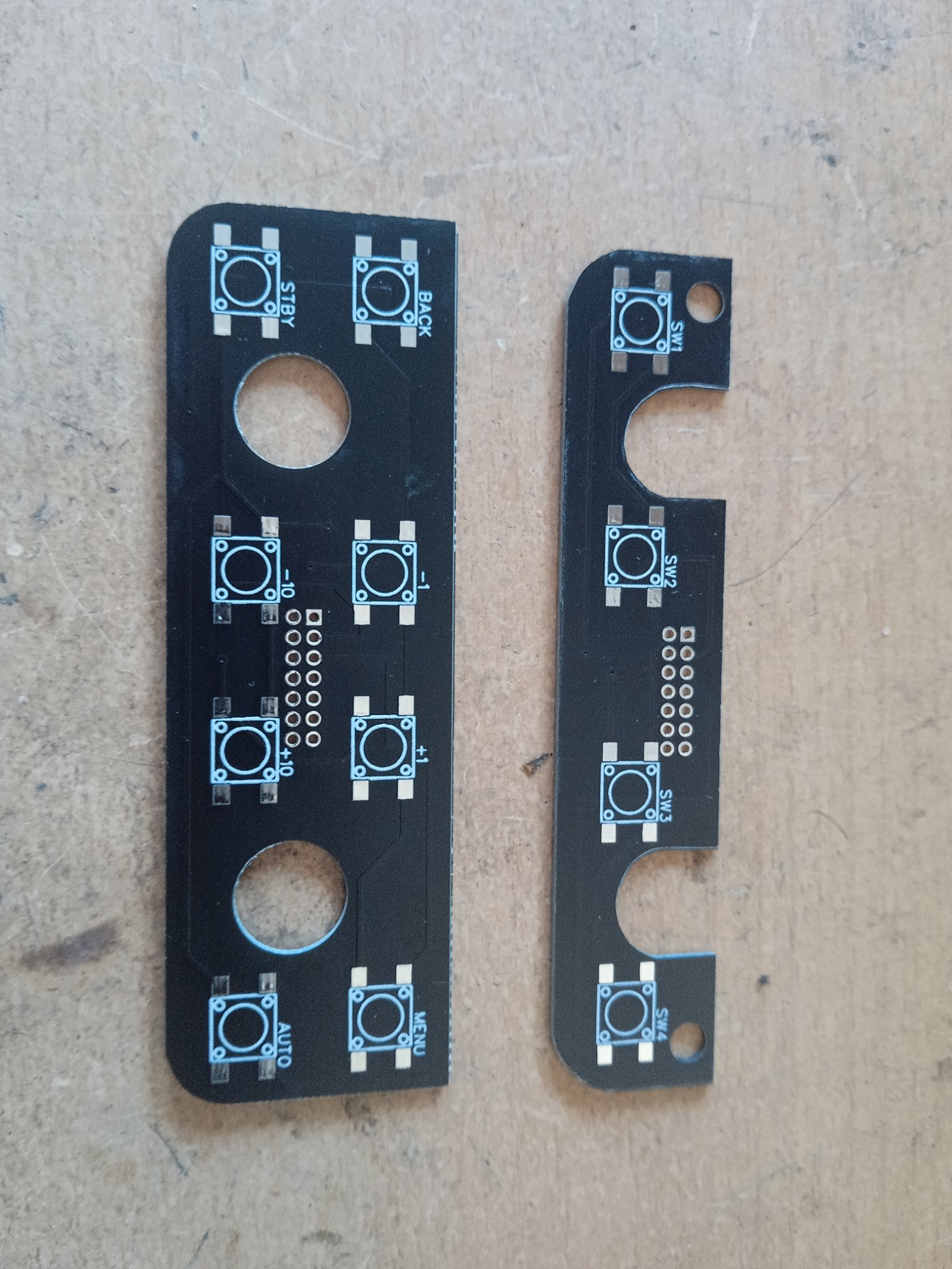 Repair is possible, but it is not worthy because you lose a lot of time that you can not charge, and over the few months it happens again... Of course as always, spare part is not available from our beloved factory so you need to buy whole new instrument for 600, 700 euros... So I made my own pushbutton boards... Black color because that is the color of my soul. I copied a design from original one, sent drawings to PCB factory in China. PCB's are proffesionally made with coating and silk layers with tolarences 1/10 mm. What is left is solder the pushbuttons and headers in place... Fits like a glove ![]()