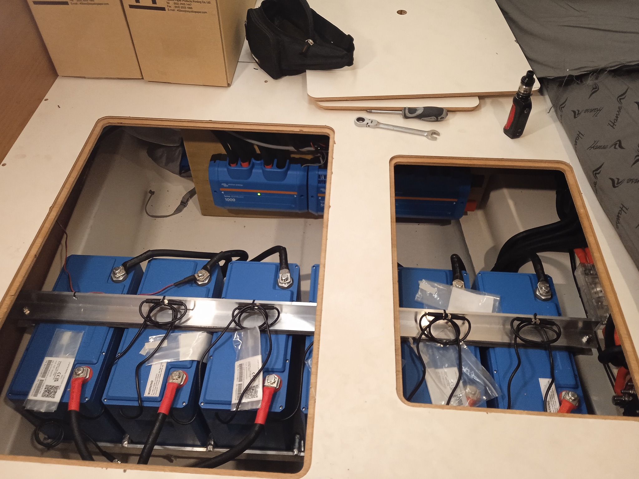 Installation of Victron lithium system. 1200Ah of lithium batteries, 1800 W of solar, Multiplus II 3000 VA inverter/charger and all the other nice things from Victron. Before/after